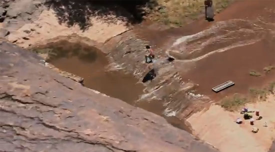 Flatland Skimboarding over a small waterfall in Santa Clara, Utah. Featuring local Utah rider Weston Wilson and DB Skimboards team rider Austin Griffin.