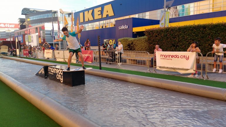On Thursday we were told that people would have free entry in the skimpark since then because entries were spent in the information points (people were given an entry for every 20 € spent in the shopping center), probably because they expected less people to come and give a chance to skimboarding. It meant that we would have more people than ever before and some fathers will let their sons for just “playing in the water”, which can be extremely disappointing and can transform the “skimpool” in to a “pool”. My friend Rodrigo and I will do our best to not reach this level.